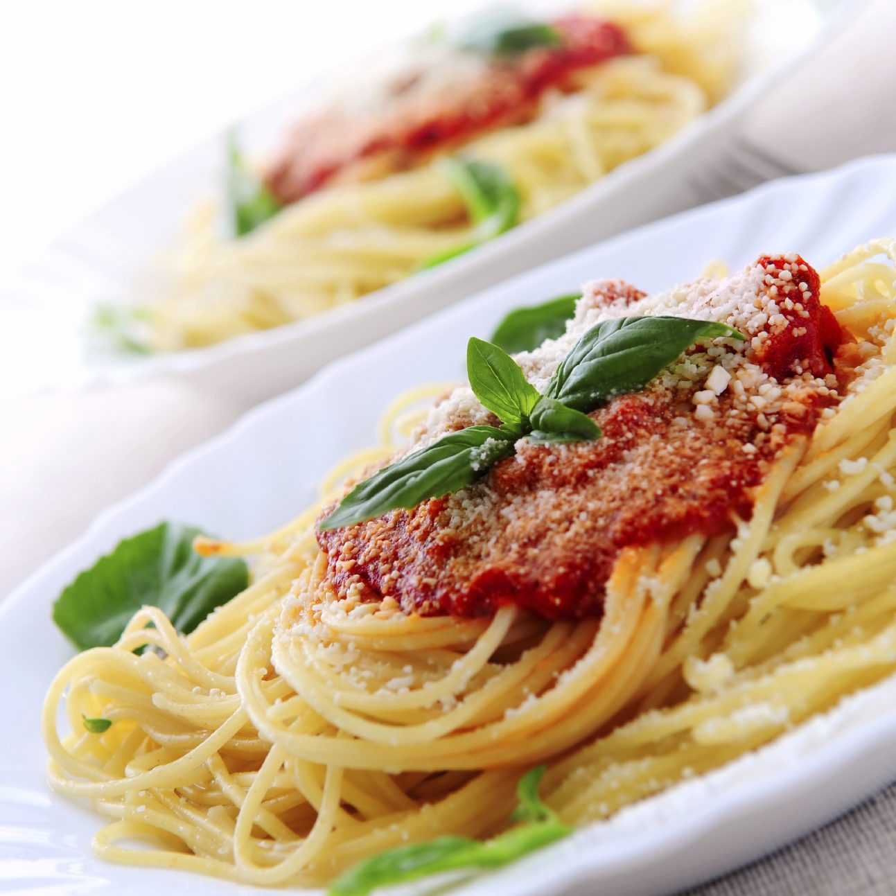 Spaghetti with Tomato Sauce: A classic favorite topped with fresh basil and grated cheese.